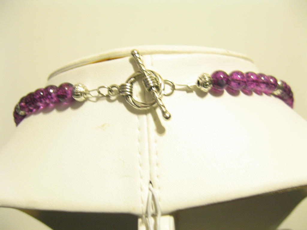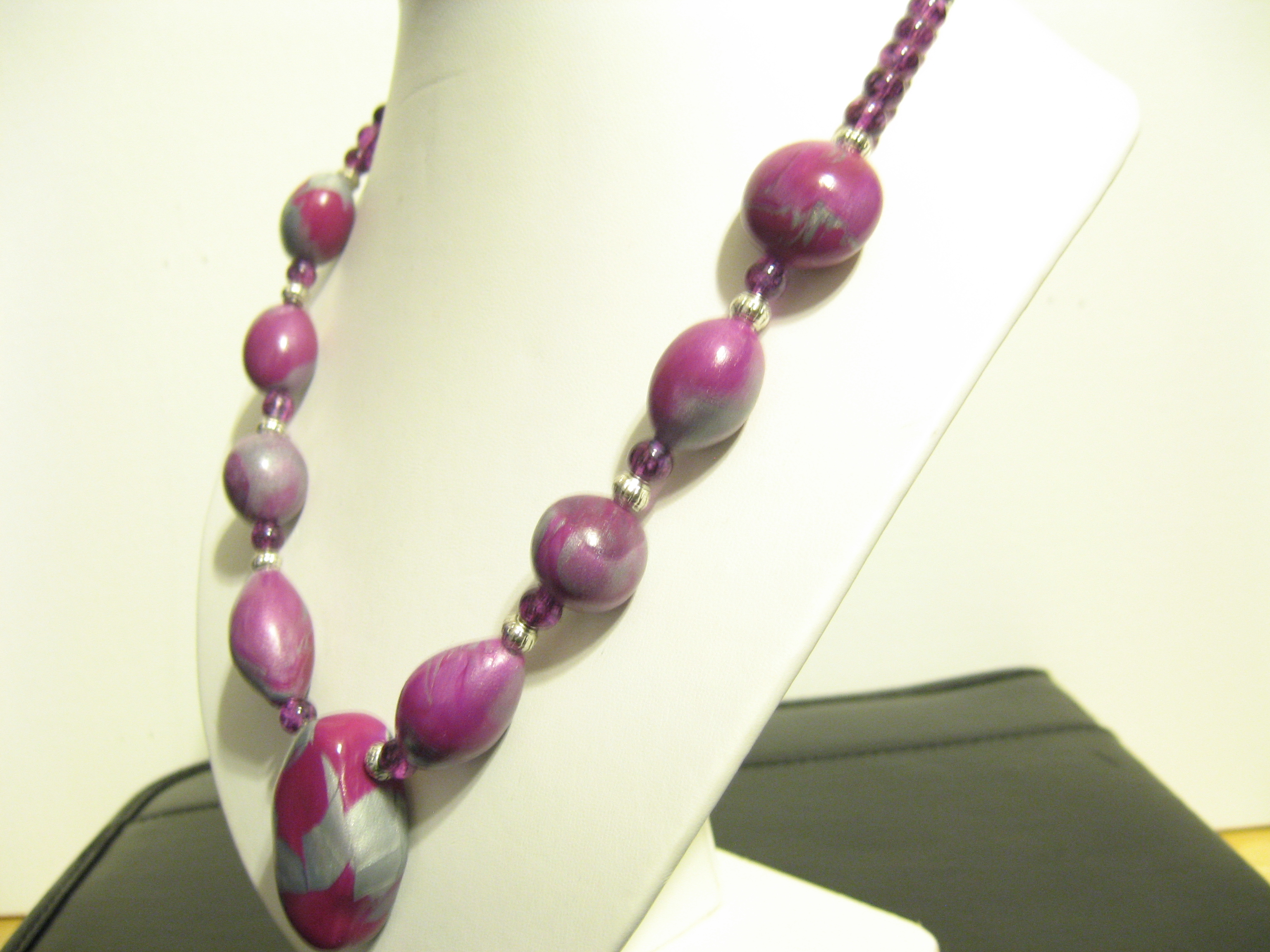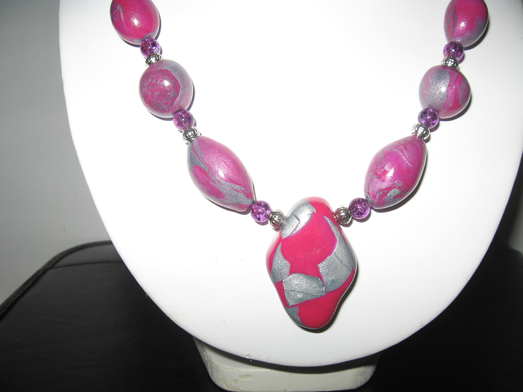 Pink and silver polymer clay beads and focal with pink glass beads and silver metal beads. 20" long with toggle clasp.