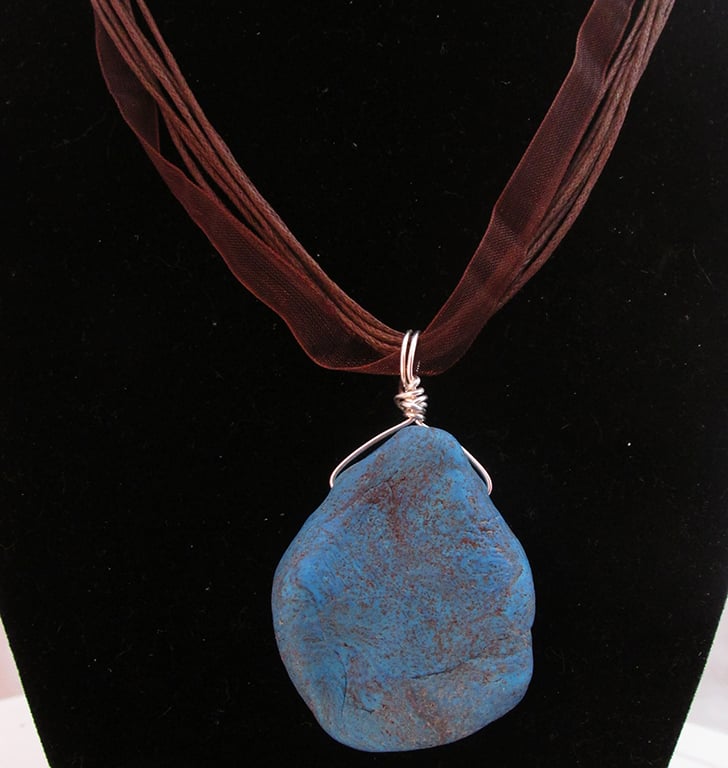 Faux turquoise polymer clay pendant (approximately 1 1/4" wide by 1 1/4" tall), flat, wide, drop shape, on wire wrapped bail and brown multi-strand ribbon/cotton cord w/lobster claw clasp, 19" long and with the extension chain, this can be an additional 3" long.