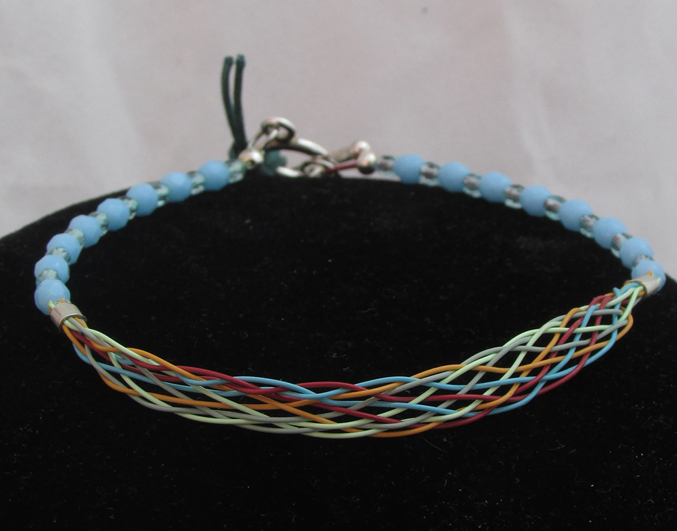 Square braid kumihimo bracelet with teal glass beads accents and a toggle clasp. 9.5 inches long.