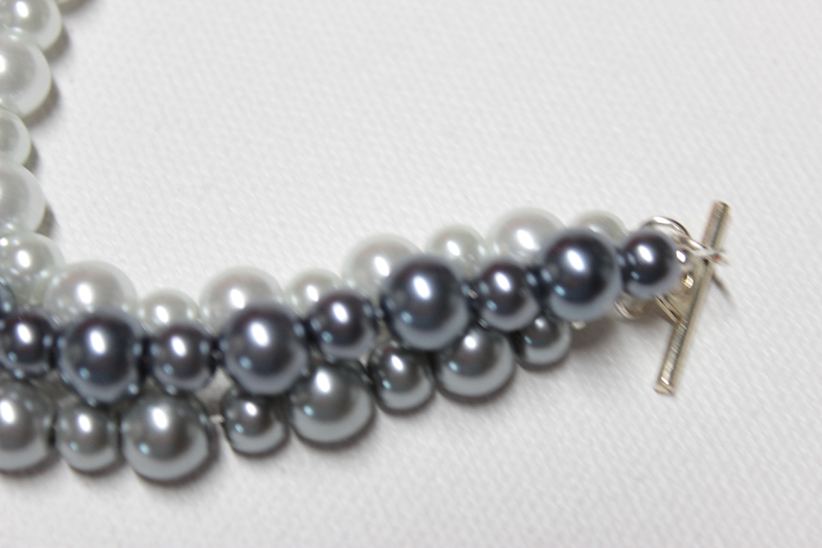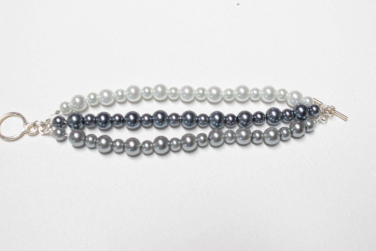 Glass pearl beads, white, gray and steel blue with toggle clasp, 6 3/4" long. Simple and elegant.