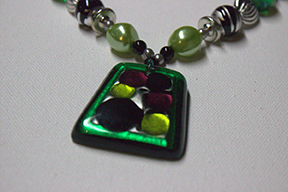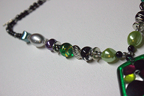 Chunky green lampwork pendant strung with purple, silver, silvery blue, black and green beads. 20.5" long w/2" extension, lobster claw clasp.