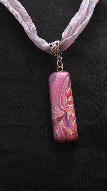 Swirly multi-color polymer clay pendant on purple hand sewn ribbon necklace. 21" long w/hook clasp.