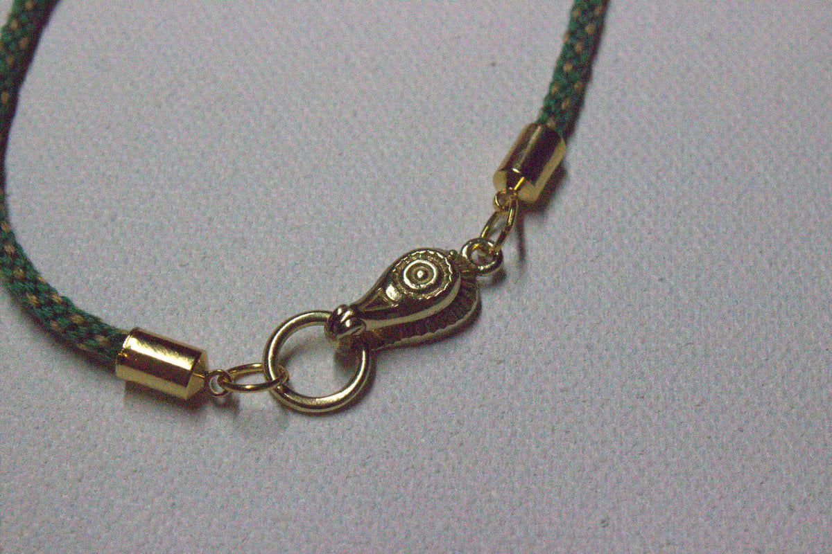 Round green shell pendant with gold decoration on green and gold kumihimo braided cord. 23" long w/unique locking magnetic clasp.