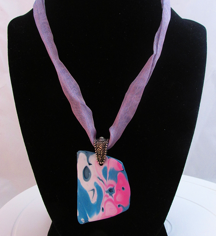 Mokume gane polymer clay pendant on hand sewn ribbon cord, 21" long w/hook and eye clasp.