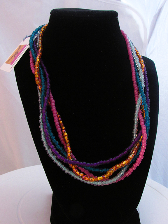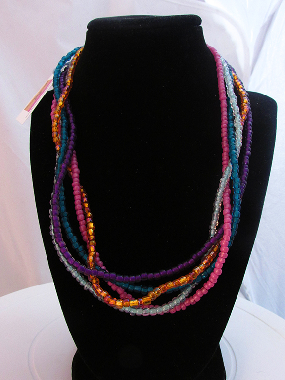 Multi-colored 5 strand seed bead necklace w/toggle clasp, 21" long.